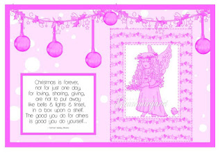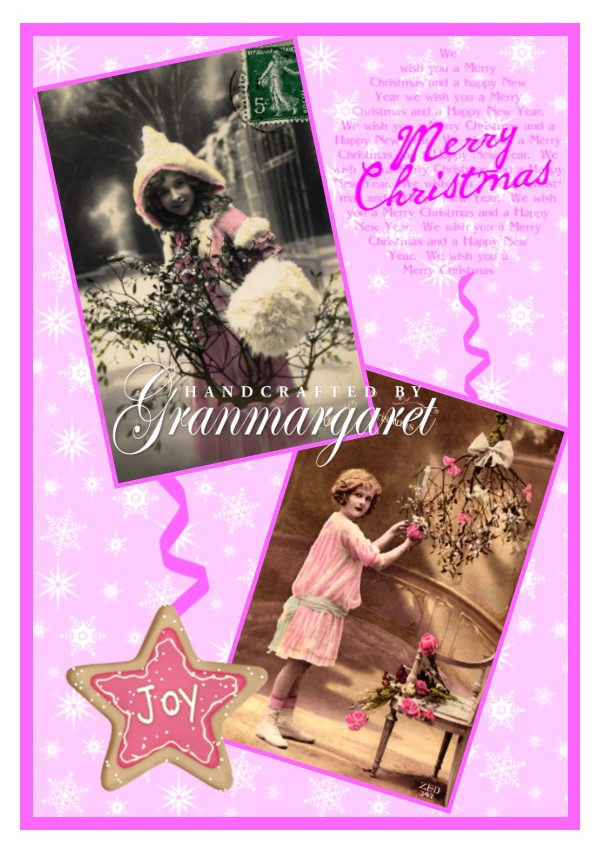 I have layered paper from Bugaboo Frosty papers set onto green card. Added Scalloped frame from Pininkie. Printed Bugaboo stamp Sunbonnet Present, coloured with markers and layered on top. Typed Happy Christmas. Added rhinestones.