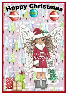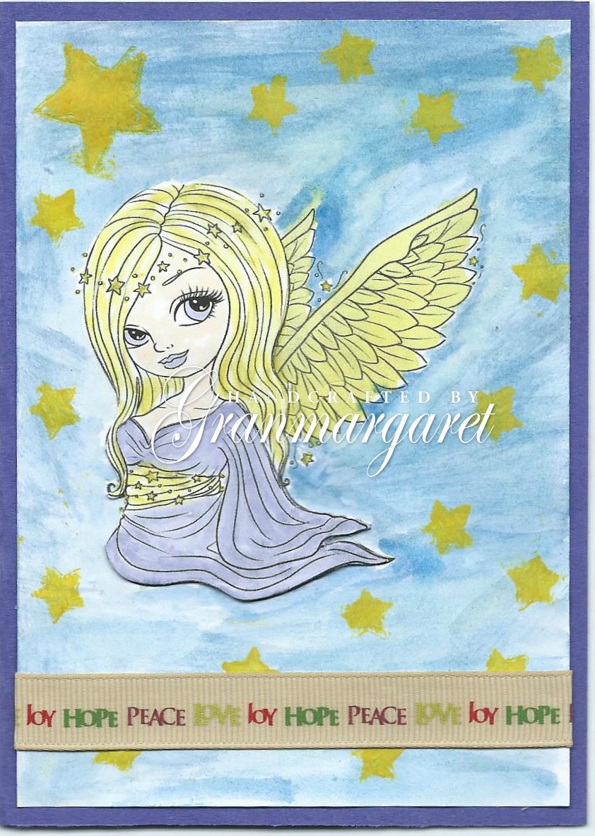 Printed Sweet Pea digi stamp "Christmas Angel" onto white card, cut out and coloured with markers and glitter pen and layered on top.