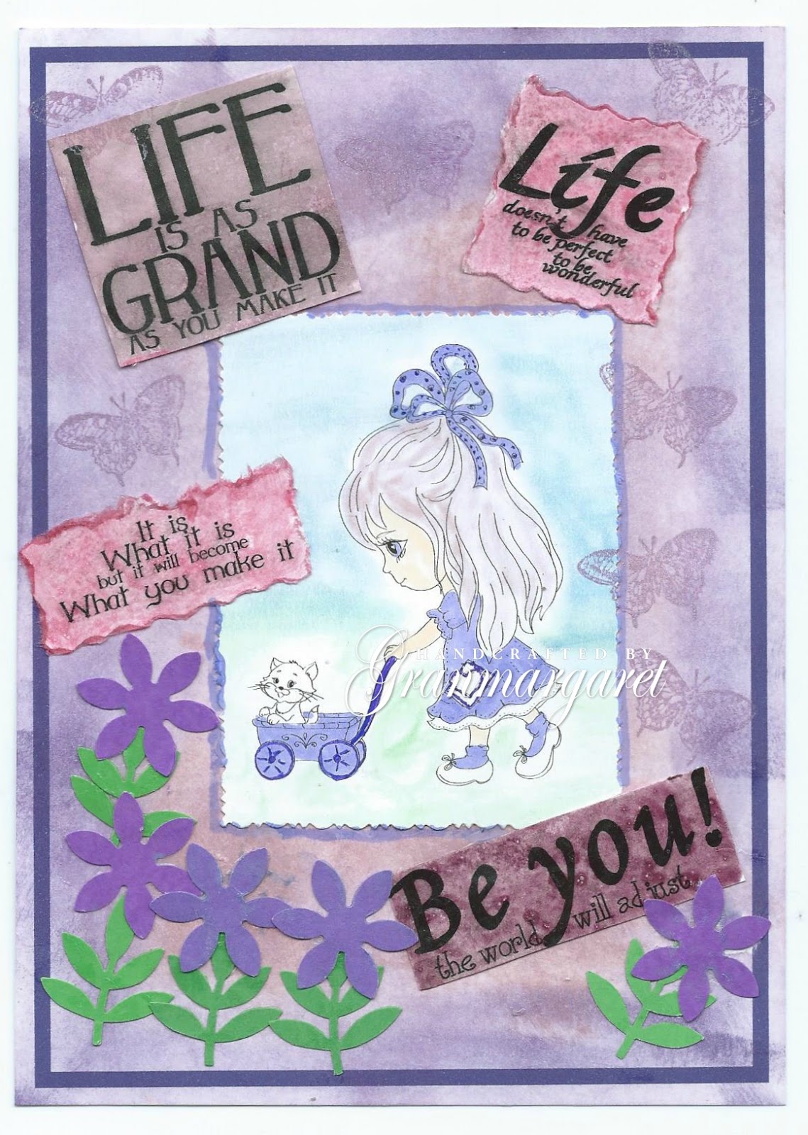 Printed Julia Spiri stamp Mollie and coloured her with markers, background with chalks and layered on top. Printed sentiments from Gingers House blog, cut out, painted with glitter glam and layered on top. Added punched flowers and leaves. Stamped butterflies.