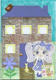 I have made a house using pattern paper from Bearly Mine A Load of Ole Bricks paper set and shapes. Coloured background with markers. Added brad for door handle. Tried to draw curtains but as you can see I can't draw. I think I should have done them a different colour.